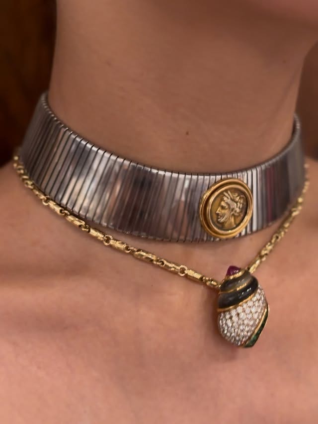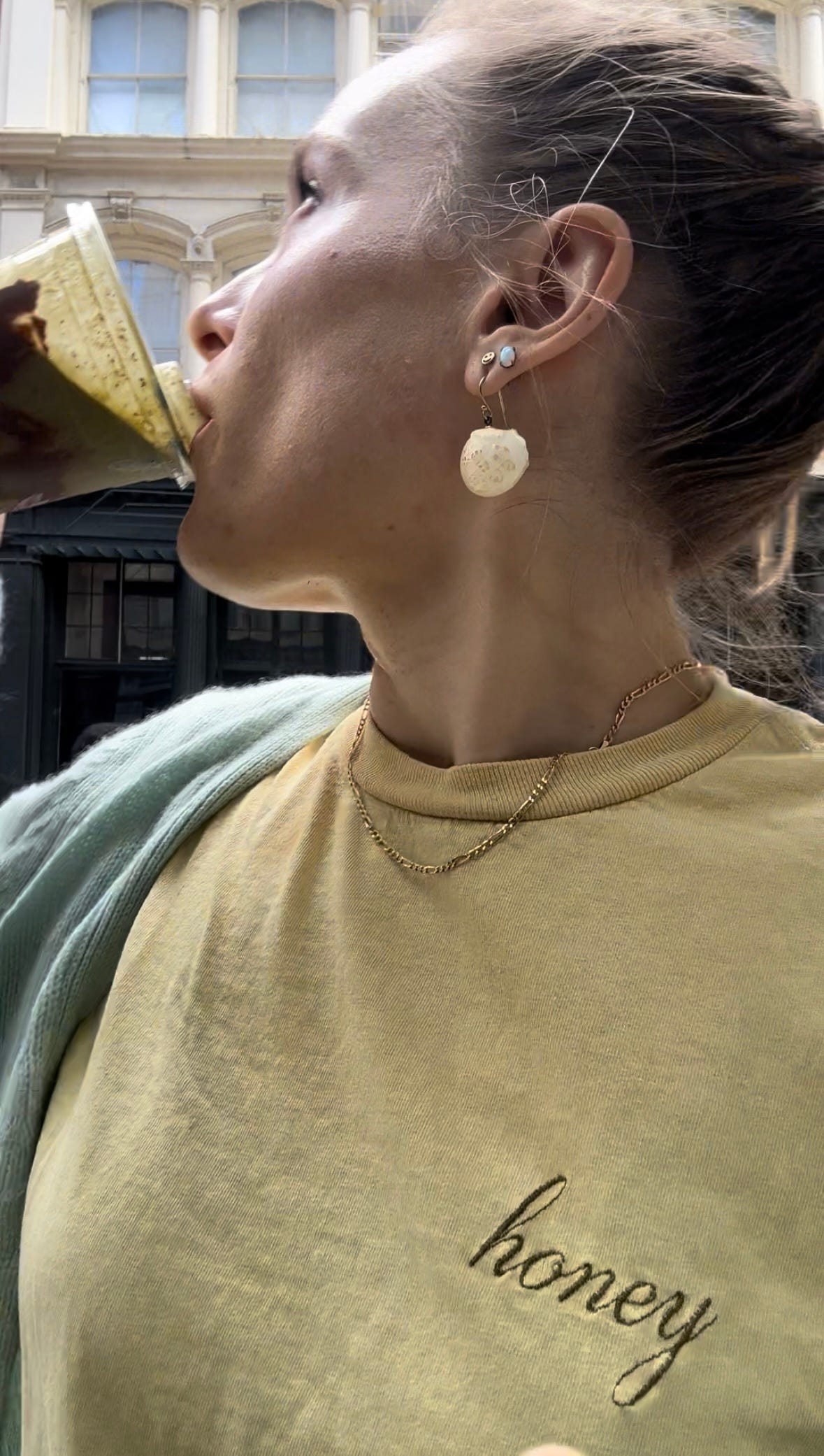 Ear party — smile from Studs, popcorn (!) & orchid (!) from Dauphinette, opal stud from don’t remember, opal and diamond cartilage earring from Catbird (now a pearl). Also gold chain from Popular Jewelry, local legend.